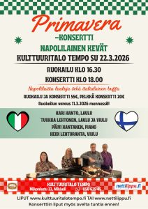 su22maa16:00- 21:00PRIMAVERA , Napolilainen Kevät konsertti + Italialainen buffa16:00 - 21:00